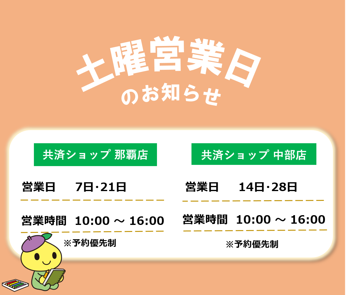 平日だけでなく共済ショップ那覇店では第1・第3土曜日、共済ショップ中部店では第2・第4土曜日も元気に営業しております。