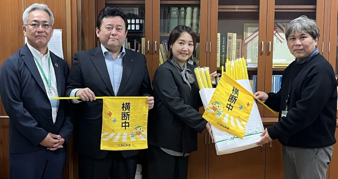 今回、こくみん共済 coop 沖縄推進本部では、日本郵政グループ労働組合沖縄地方本部様とともにお見積もり件数に応じて横断旗400本をうるま市高江洲小学校へ寄贈しました。