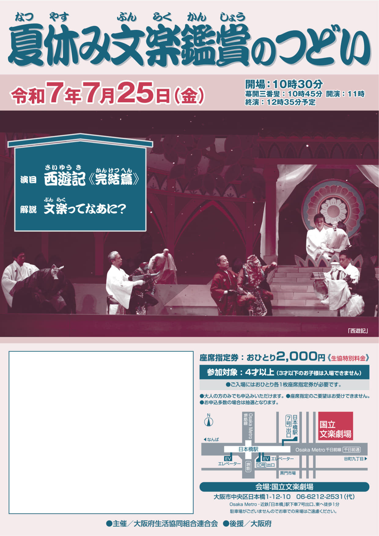 大阪府生活協同組合連合会(大阪府生協連)では、大阪が誇る伝統芸能「文楽」を、組合員の皆さまにより身近に感じていただけるよう、本年も「夏休み文楽鑑賞のつどい」を開催いたします。