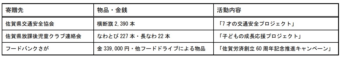 また、佐賀推進本部独自の取り組みとして、ひとり親家庭への支援を実施しているフードバンクさがの賛助団体へ登録し、協働して取り組んでいます。本年度も、各団体へ下記のとおり寄贈することができました。