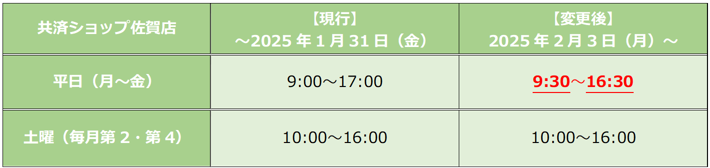 2025年2月3日(月)より、共済ショップ佐賀店の営業時間および受電時間を以下のとおり変更いたします。