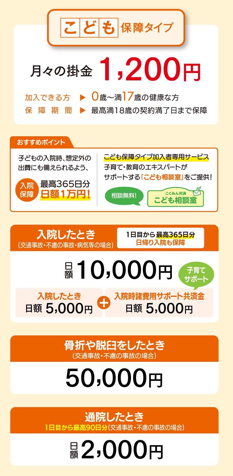 もちろん「こくみん共済 coop」には、子どもたちのけがや骨折など万一のときに備えられる保障「こども保障タイプ」もご用意しています。