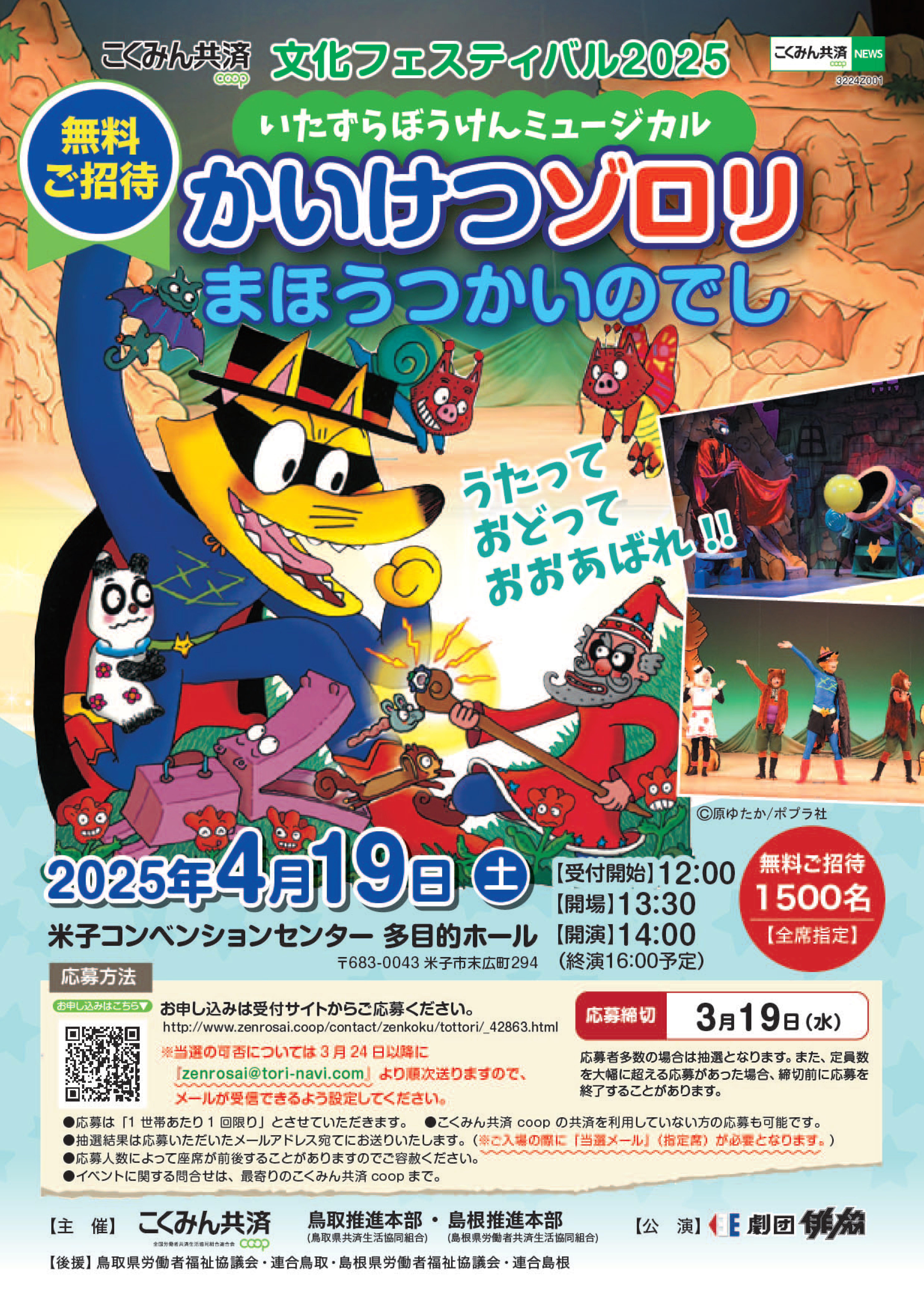 こくみん共済 coop の公式ホームページこくみん共済 coop について地域からのお知らせ(島根)2025年のお知らせ(島根)こくみん共済 coop 文化フェスティバル2025 「かいけつゾロリ まほうつかいのでし」開催のお知らせ