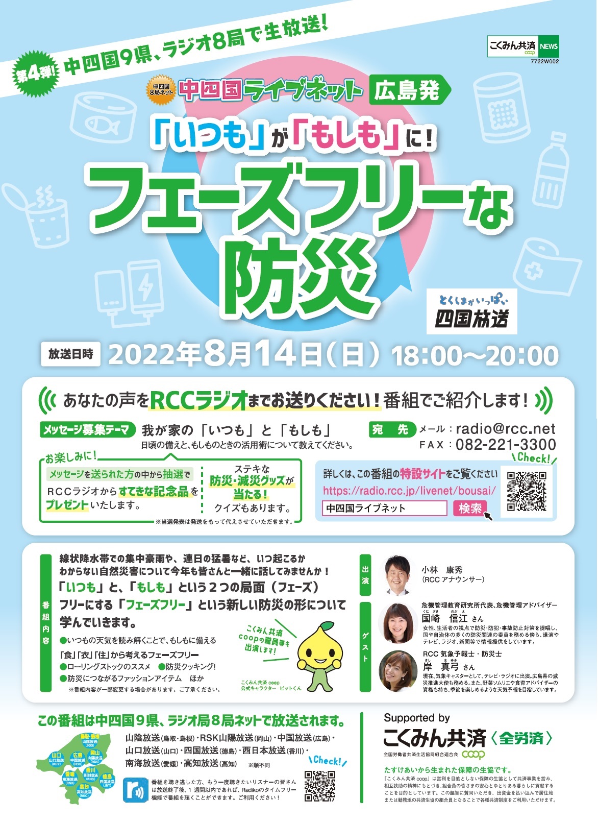 全国各地で自然災害が多数発生する中、こくみん共済 coop として日常的な災害への備えについて、危機管理アドバイザーの国崎伸江さん、中国放送 気象予報士の岸 真弓さんをゲストに迎え、中四国9県、ラジオ8局で生放送します。