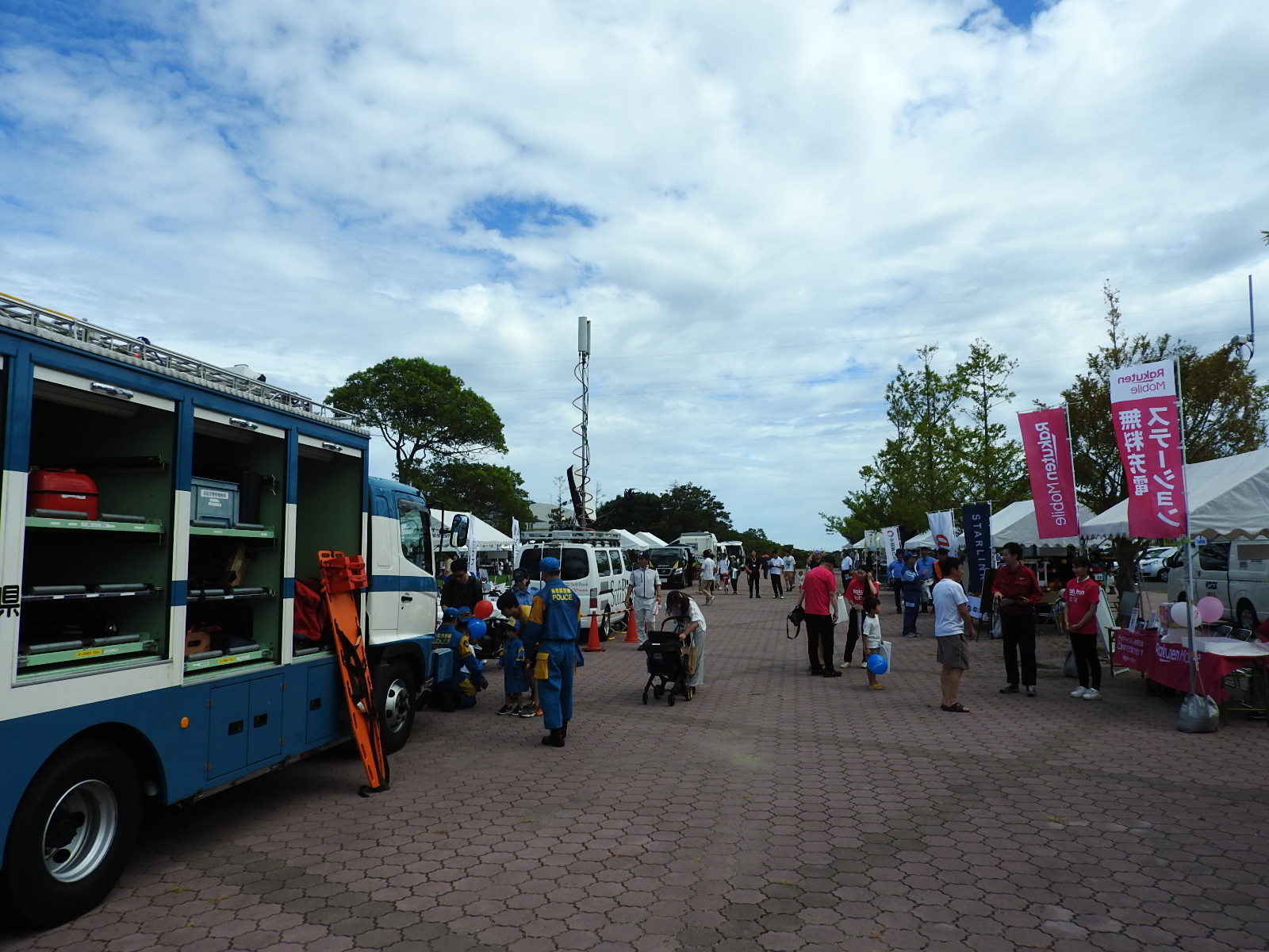 屋外ブースでは、自衛隊車両や消防車両が展示され地震体験車・降雨体験機など多くの方が実際に体感していました。