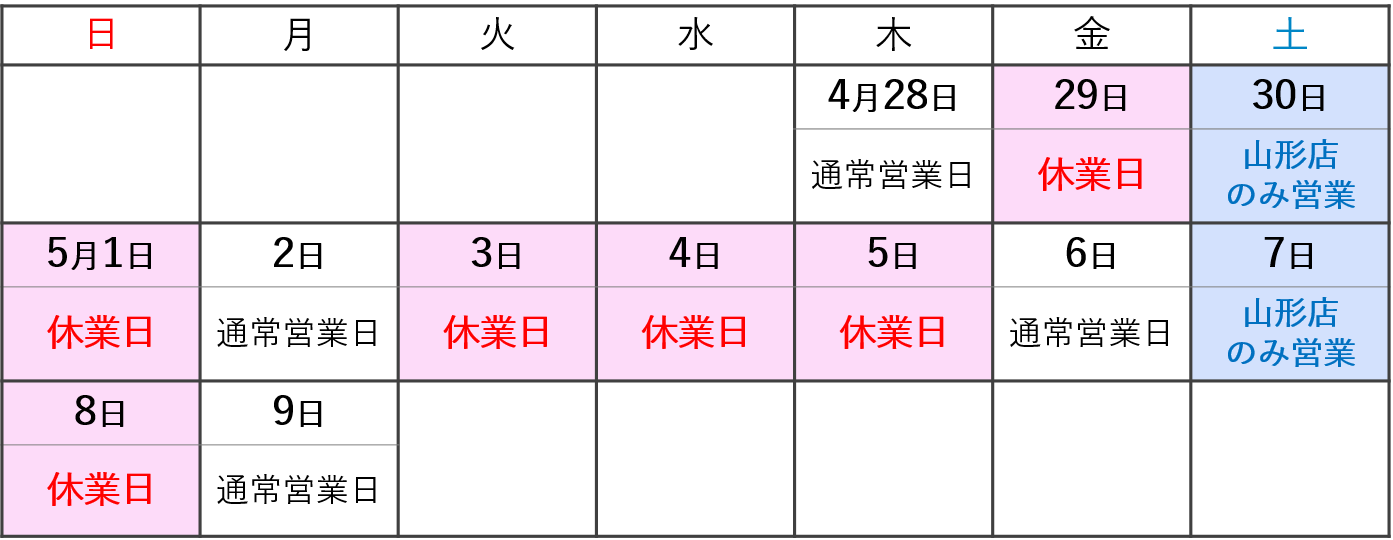 ゴールデンウィーク期間(4/29~5/8)の営業に関するお知らせ