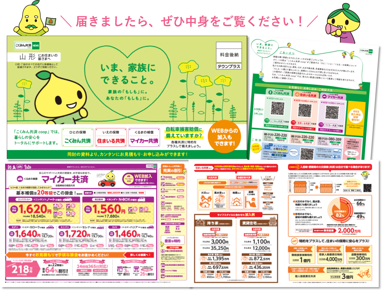 県内の市町村(配布エリア限定)に ひと・住まい・くるまの保障の 加入申込・お見積もり・資料請求ができるご案内を お送りしています。