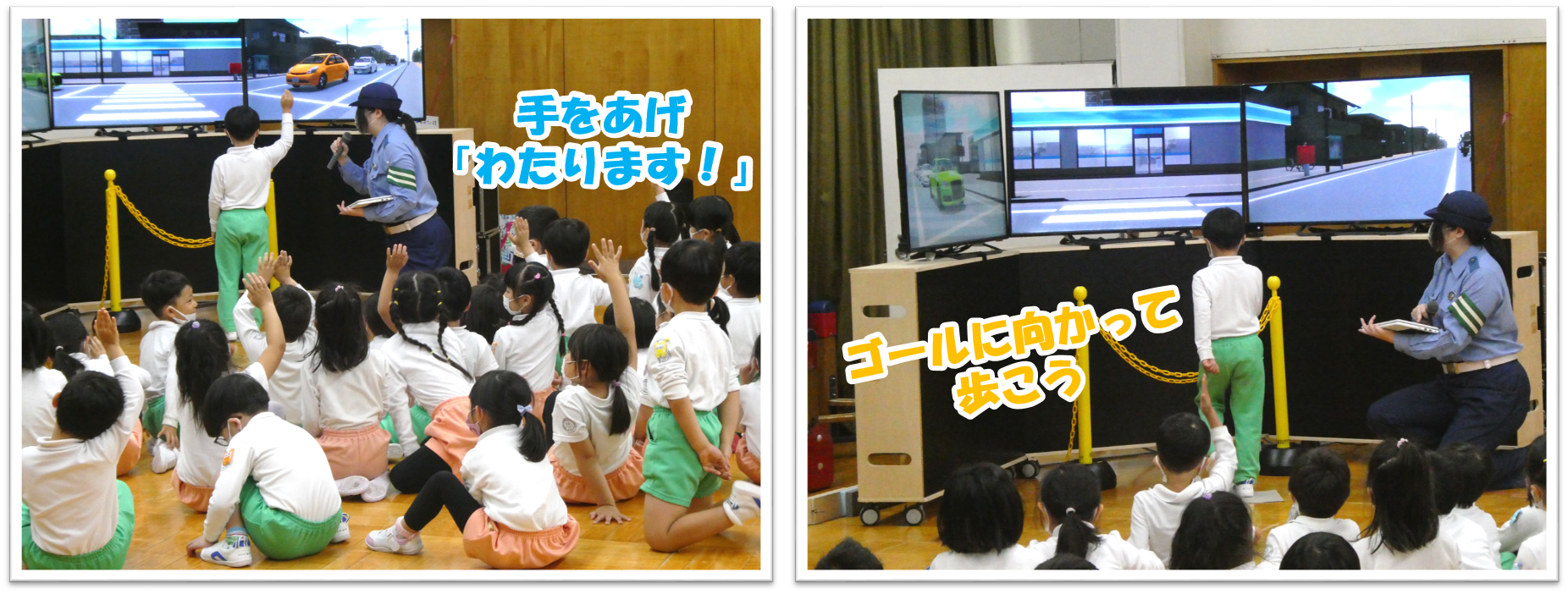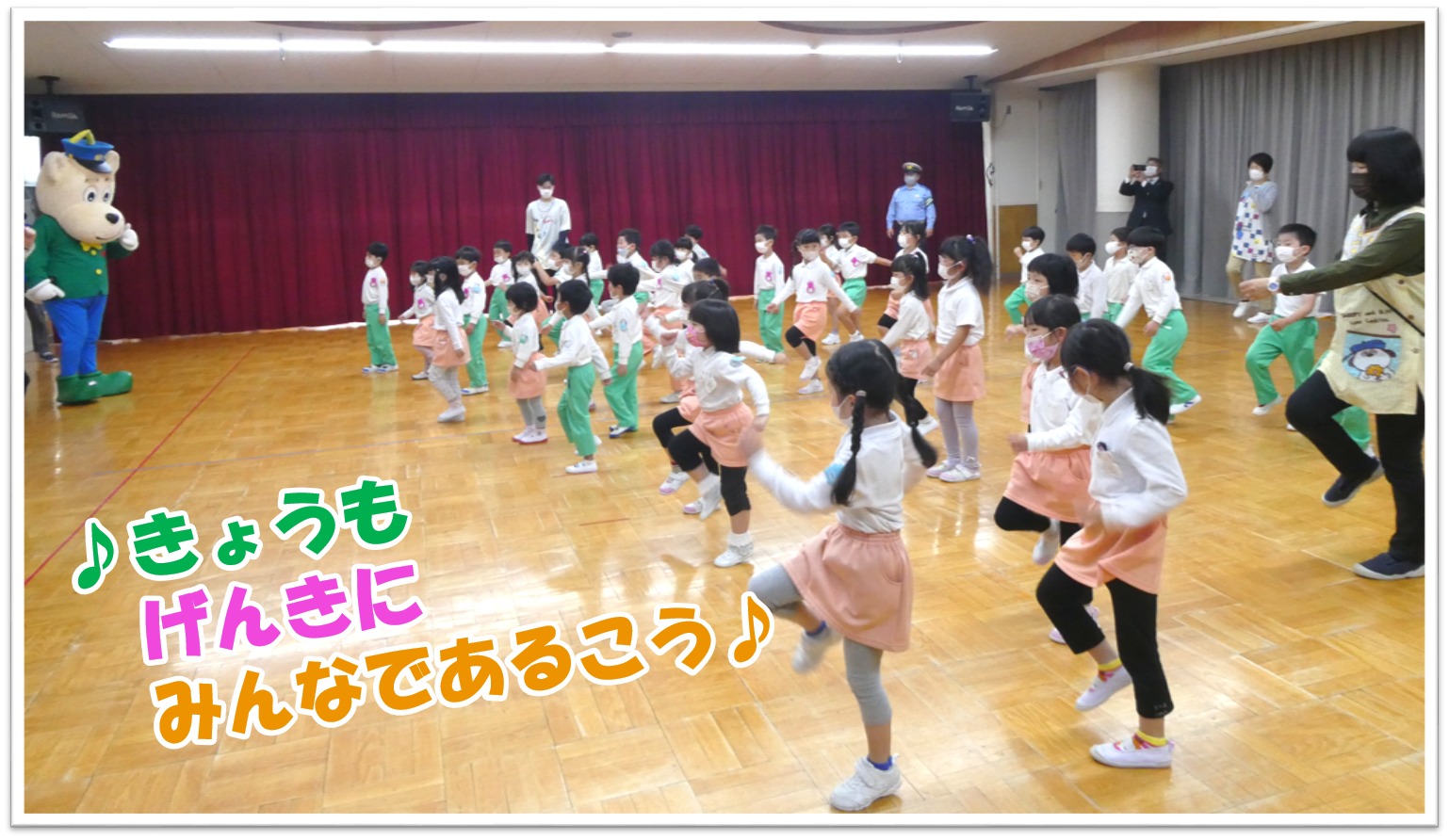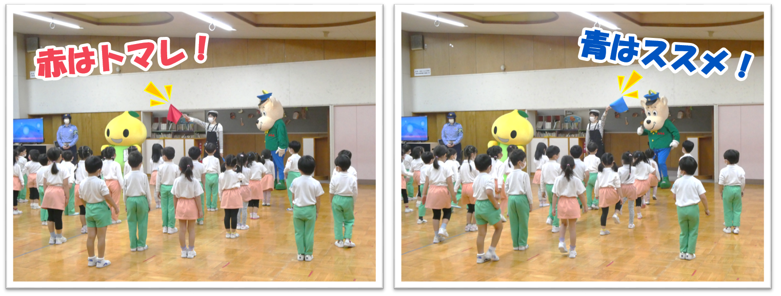 フリをみんなで一緒にやりながら、交通ルールについてお勉強します。