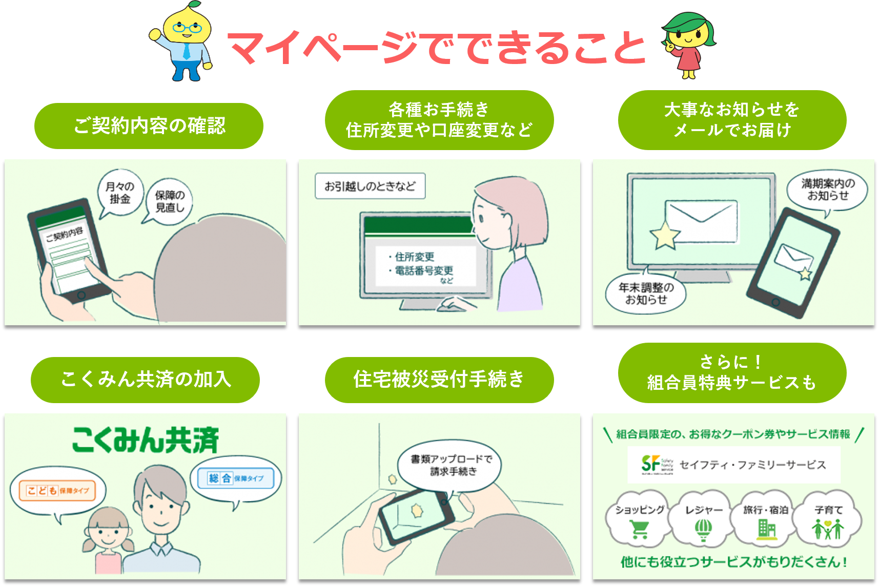 マイページは、24時間いつでもインターネットで保障内容・登録内容などの確認や住所変更などの各種お手続きができる組合員専用サービスです。 普段忙しくて自分の時間がとれない方や、共済ショップに行くことが難しい方などに最適です。 詳細についてやご登録はこちらから! 今後も組合員の皆さまにとって便利で、お役に立つ機能をどんどん追加していく予定です。ぜひ、ご登録をお願いします!