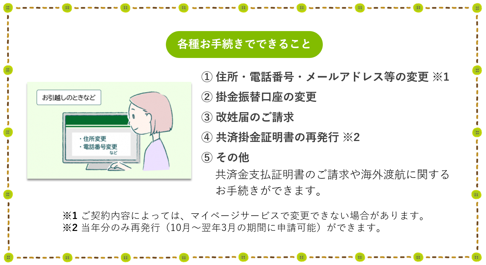 マイページは、24時間いつでもインターネットで保障内容・登録内容などの確認や住所変更などの各種お手続きができる組合員専用サービスです。 普段忙しくて自分の時間がとれない方や、共済ショップに行くことが難しい方などに最適です。 今回は「各種お手続き」についてご案内いたします!