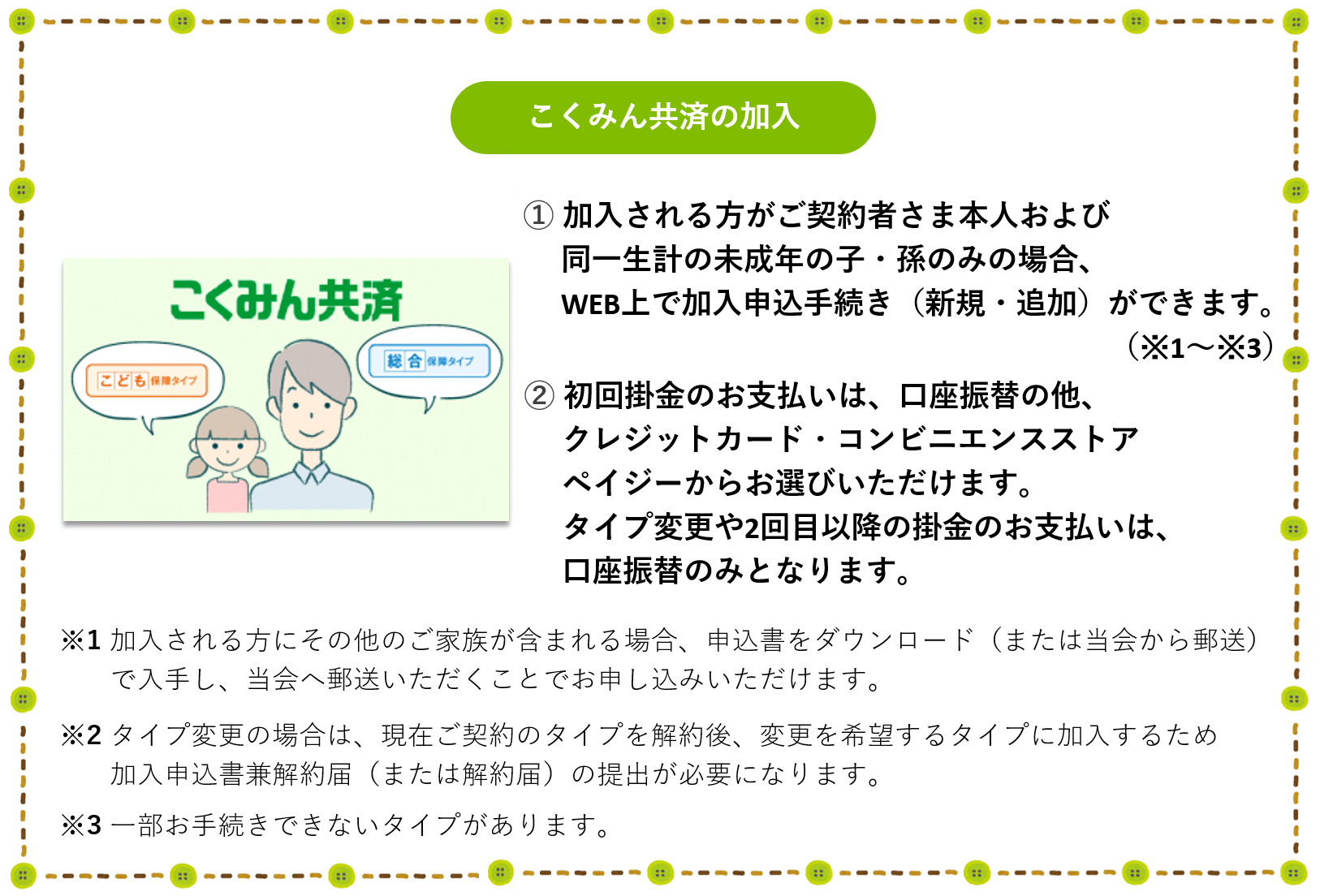 マイページから こくみん共済の加入ができるようになりました! 操作に不安な方はお近くの共済ショップまで お気軽にお越しください。 マイページの詳細についてやご登録はこちらから ぜひ、使ってみてくださいね!