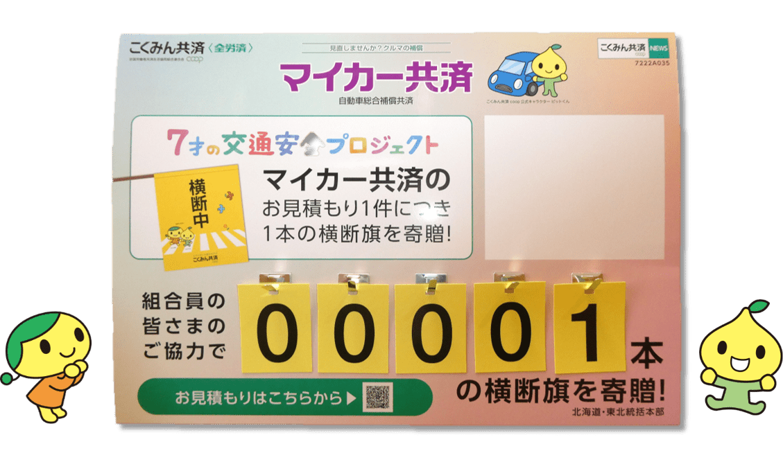2019年より、マイカー共済のお見積もり1件につき1本の横断旗を寄贈する取り組みを行っています。 多くの皆さまのご協力により、 これまでに約753,000本(ピットくん・コーすけコラボ横断旗含む)の 横断旗を全国の児童館・小学校などへ 寄贈することができました! 今回、引き続き皆さまとともにこの活動に取り組むために、 窓口に「横断旗メーター」を設置しています。 店舗ごとに寄贈する横断旗の数をカウントします。 子どもたちを交通事故から守るために ぜひ、この取り組みにご協力ください。