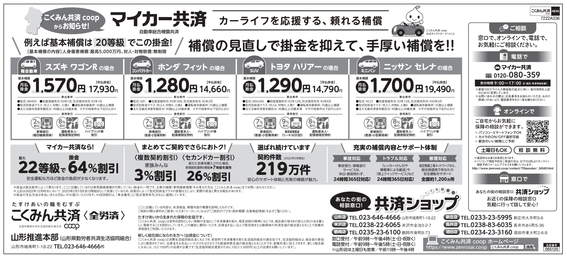 <山形新聞2022年12月朝刊 不定期掲載> 2022年12月の朝刊では、マイカー共済をご紹介。20等級の場合の基本保障の例を掲載しています。