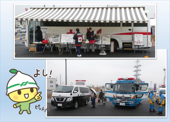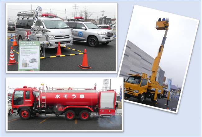 地震体験車、はしご車、警察車両など