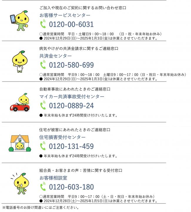 山形推進本部・各共済ショップ窓口の年末年始営業日を