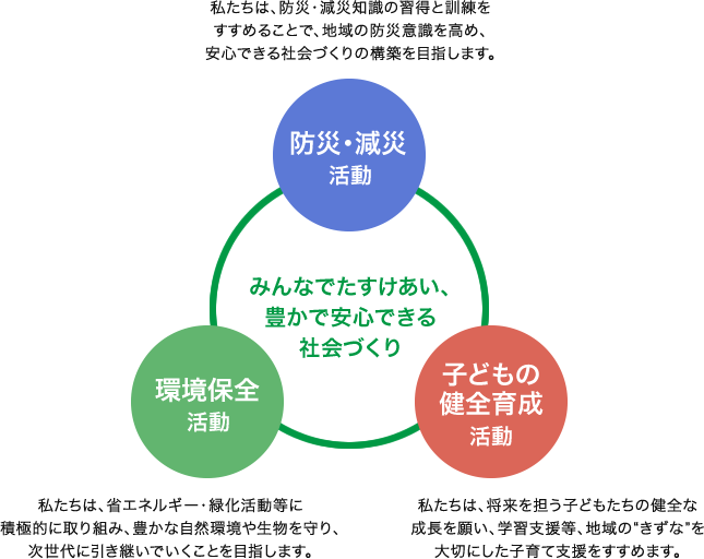 こくみん共済 coop は、「みんなでたすけあい、豊かで安心できる社会づくり」という理念にもとづき、積極的に地域社会に貢献する活動を展開しています。豊かで安心できる社会が形成され継続するために、「防災・減災活動」「環境保全活動」「子どもの健全育成活動」を重点分野と位置づけ、さまざまな社会活動に取り組んでいます。