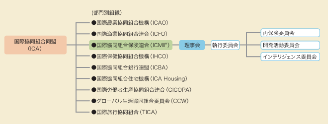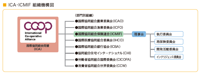 具体的には、国際協同組合同盟(ICA)、国際協同組合保険連合(ICMIF)に加盟し、それぞれの活動への参画や会員団体との交流を通じて、協同組合運動の国際的普及と推進のための活動や、海外の協同組合や相互扶助の保険団体などの社会的経済組織をはじめとするさまざまな団体との情報交換を行っています。