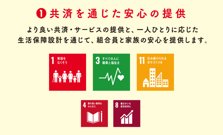 より良い共済・サービスの提供と、一人一人に応じた生活保障設計を通じて、組合員と家族の安心を提供します。