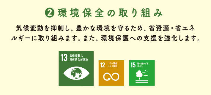 気候変動を抑制し、豊かな環境を守るため、省資源・省エネルギーに取り組みます。また、環境保護への支援を強化します。