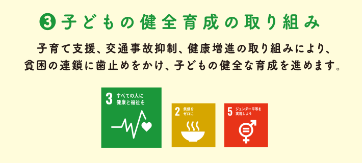 子育て支援、交通事故抑制、健康増進の取り組みにより、貧困の連鎖に歯止めをかけ、子どもの健全な育成を進めます。
