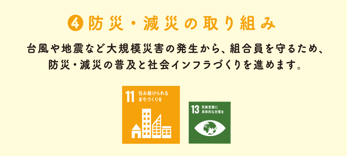 台風や地震など大規模災害の発生から、組合員を守るため、防災・減災の普及と社会インフラづくりを進めます。