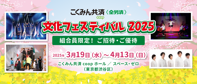 2025年3月19日(水)~4月13日(日)の期間、こくみん共済 coop ホール/スペース・ゼロ(JR新宿駅南口・徒歩5分)において『こくみん共済 coop〈全労済〉文化フェスティバル2025』を開催します。