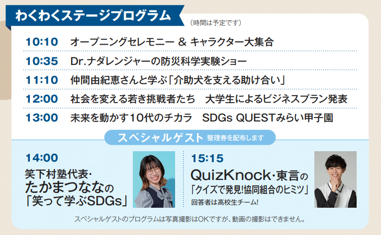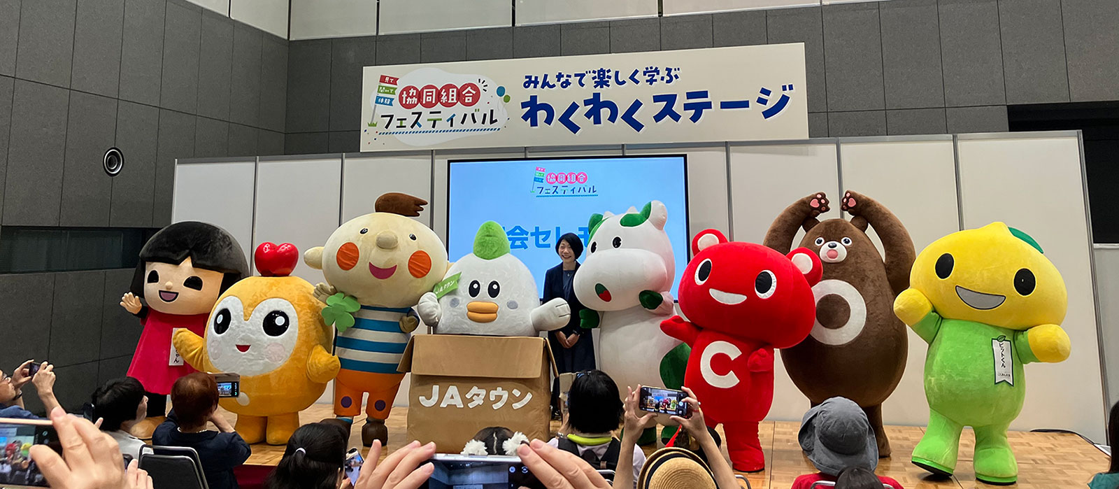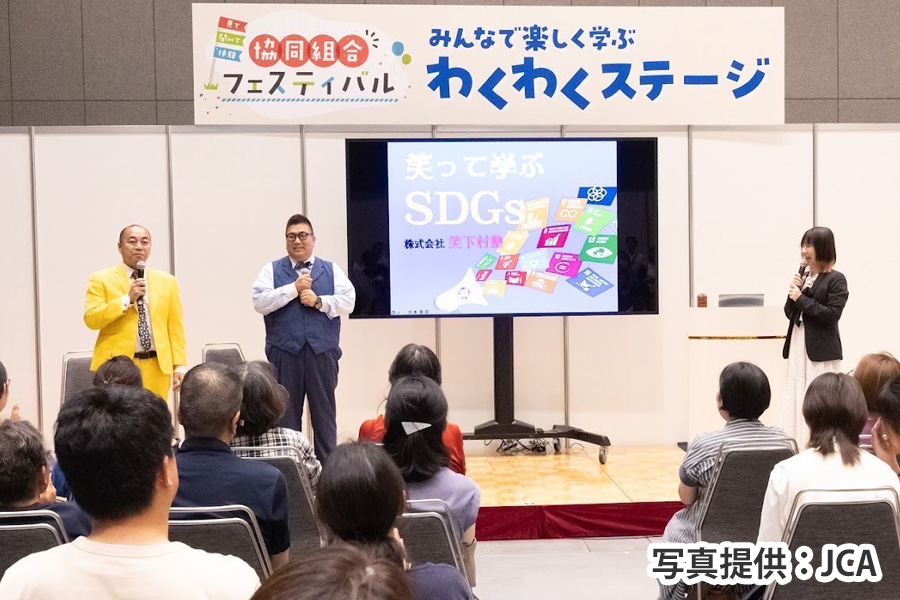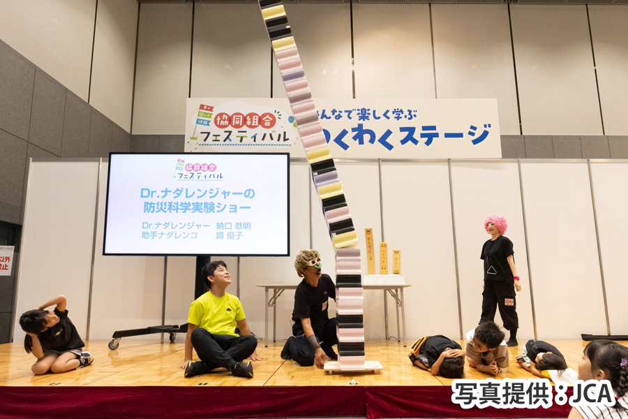 協同組合のキャラクターが大集合のオープニングイベントにはじまり、Dr.ナダレンジャーの防災科学実験ショー、仲間由紀恵さんと学ぶ「介助犬を支える助け合い、たかまつななの「笑って学ぶSDGs」、QuizKnock・東言の「クイズで発見!協同組合のヒミツ」などさまざまなプログラムが実施され、盛り上がりました。