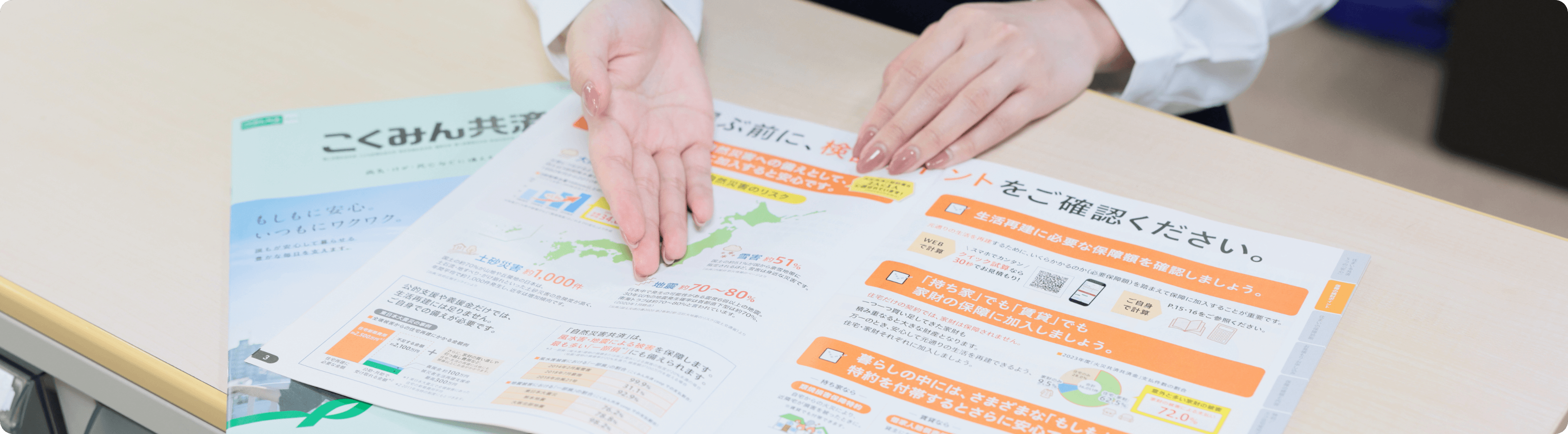 組合員に共済金をお支払いする事由が発生したときに、請求書類の受付、審査、支払いまでを担う部門です。⽣命系(病気・けが・死亡)から損害系(⽕災・災害・交通事故)まで、幅広い分野に対応しています。